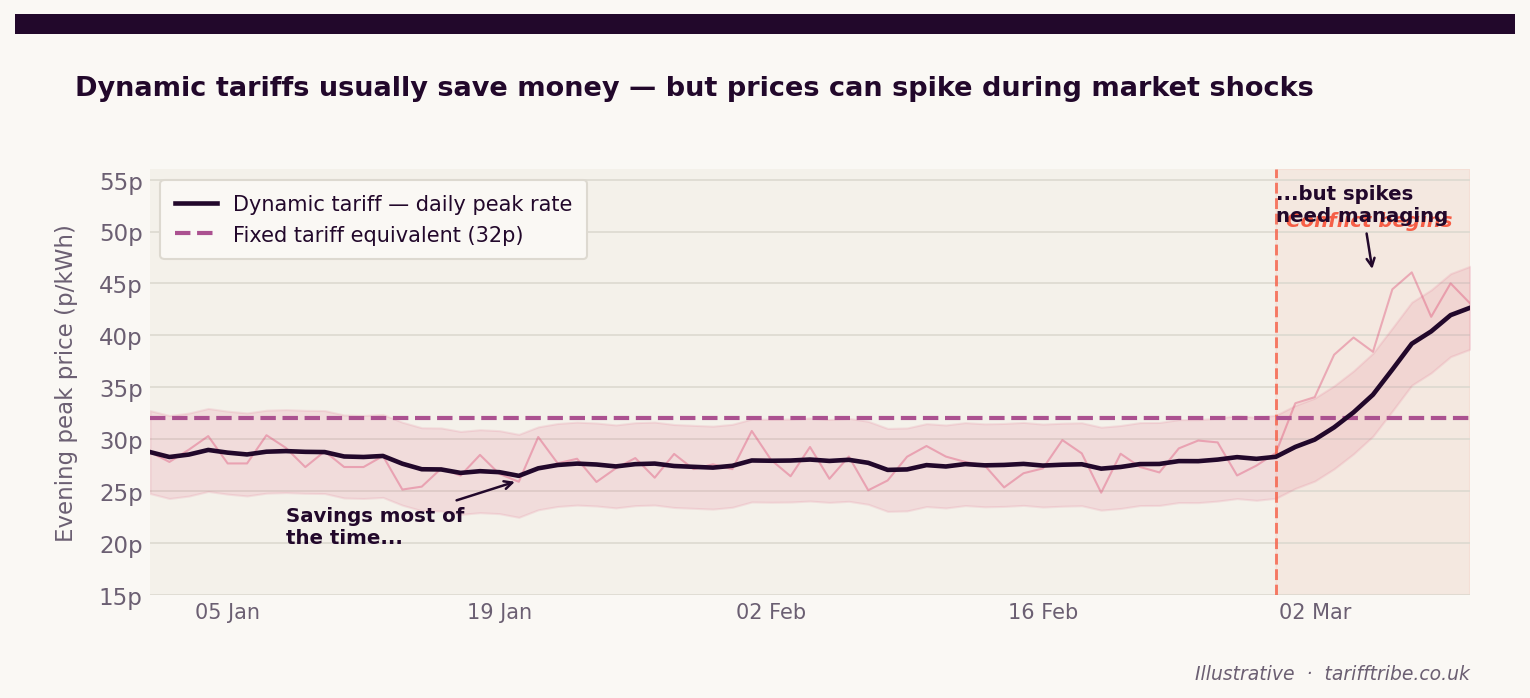 The chart above shows this in practice. During a stable period, the dynamic tariff is almost always cheaper. When a shock hits the market, peak prices can spike sharply — sometimes for days or weeks at a time.