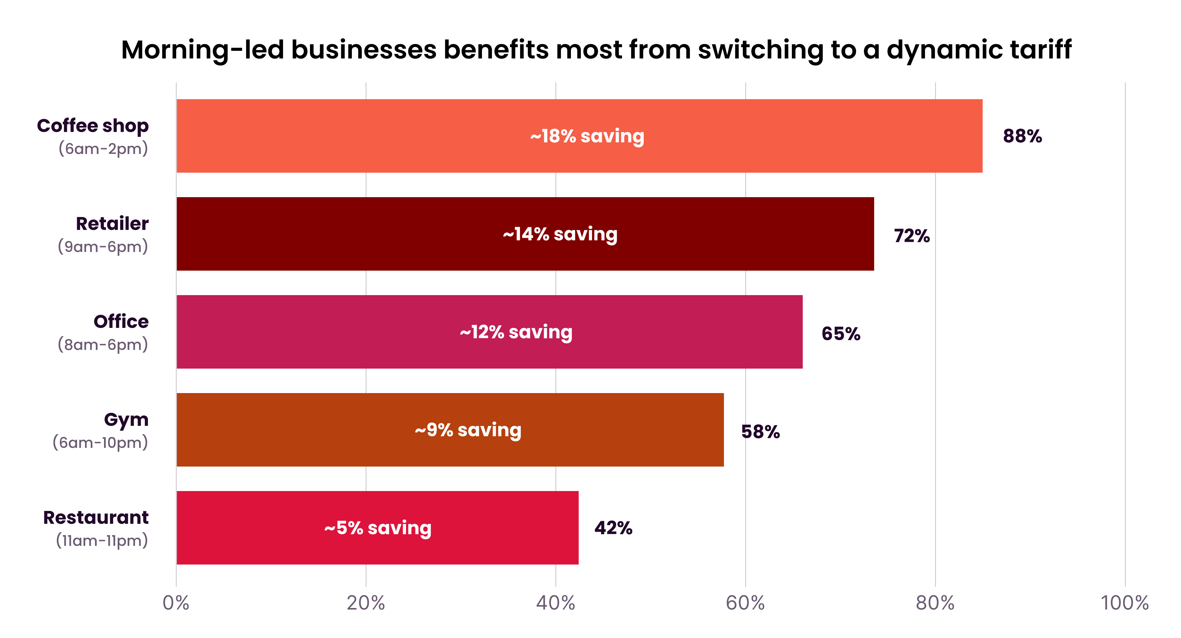 Coffee shops and morning-led businesses come out on top. If you open at 6am and close at 2pm, your coffee machines, grinders, fridges and lights are running almost entirely during the cheapest hours of the day. Switching to the right dynamic tariff could reduce your electricity costs by around 15–20%.