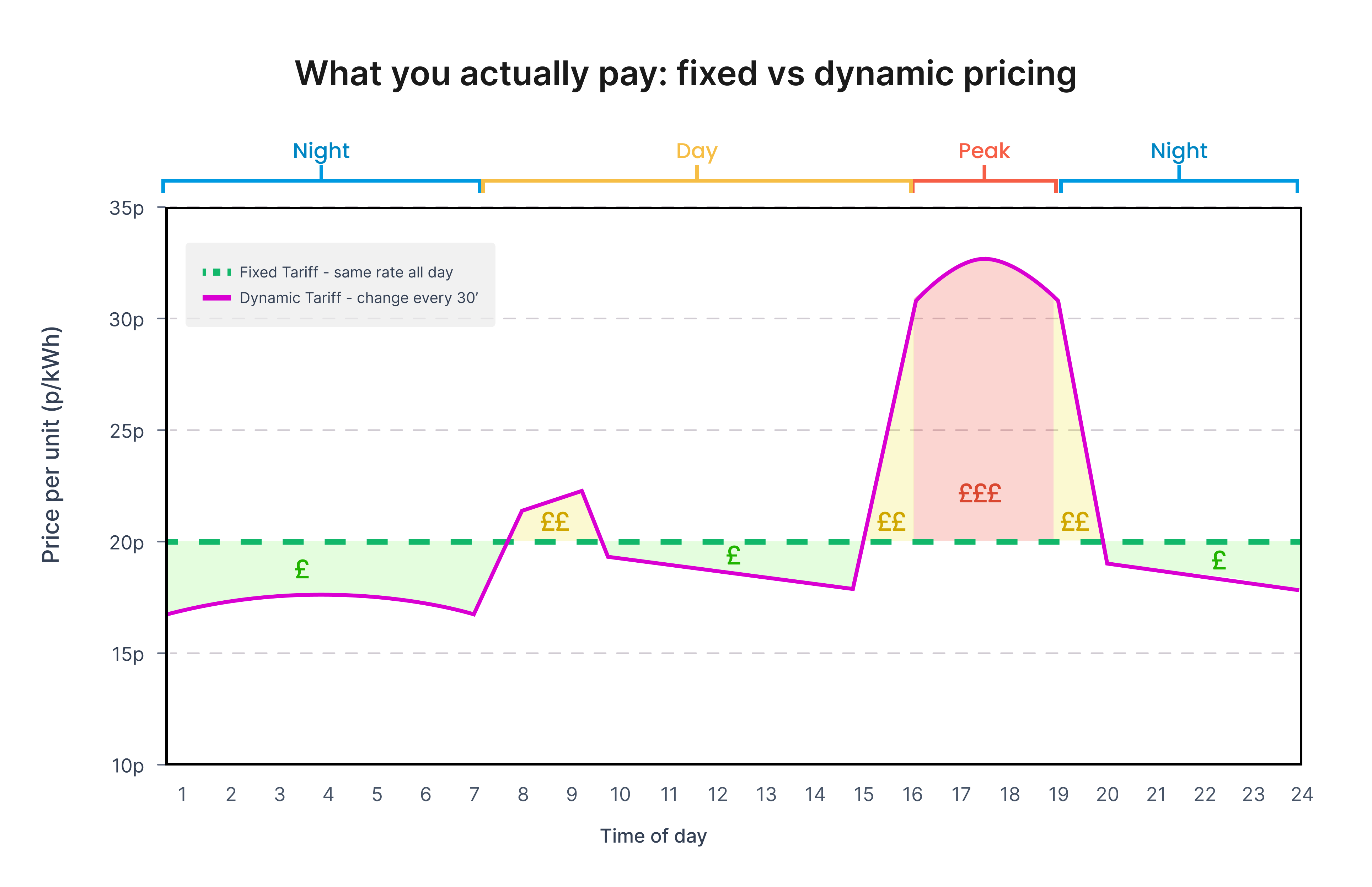 The chart below shows how a fixed tariff compares to a dynamic one across a typical day. On a fixed tariff, the dashed line shows you’re paying the same rate whether it’s 3am or 6pm. On a dynamic tariff, the price rises and falls with actual demand.